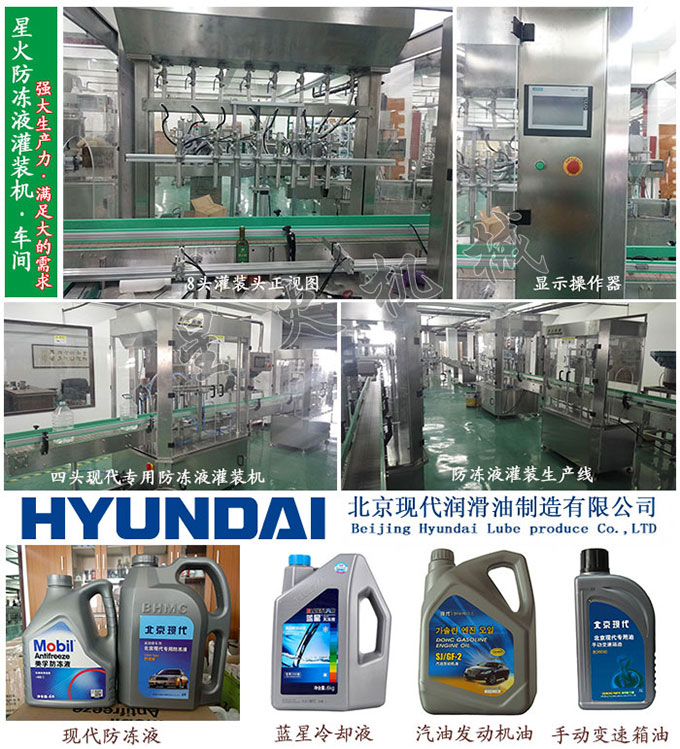 汽車已經成為了人們生活當中所常見的一種工具,對于愛車一族來說,車離不開防凍液的存在,市場上更是品牌眾多,如長城 、科萊恩、昆侖、加德士、美孚防凍液等等,有這么多的品牌就說明了防凍液是一大市場,汽車對其的需求量很大,也因此成就了防凍液灌裝相關生產設備以及灌裝機生產企業。近期北京現代潤滑油制造有限公司在我司購買了一條大型的防凍液灌裝生產線,該生產線主要由防凍液灌裝機、旋蓋機、輸送帶、收瓶機、理瓶機等設備組成,目前該套設備已經投入到該企業廠房中進行生產。