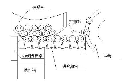 進瓶是機器工作程序的第一環節,首先切勿將碎瓶及有裂痕的壞瓶誤放進瓶斗內,瓶在瓶斗內通過進料斗斜度及瓶自重推動。瓶徑落瓶軌道送入進瓶螺桿。為使瓶能順利進入進瓶螺桿,落瓶軌道寬度要適宜。防止軌道過寬而使瓶橫倒,軌道過緊而卡住瓶子使落瓶不暢造成后續缺瓶而倒瓶,引起瓶在落瓶軌道口與進瓶螺桿銜接處軋瓶,瓶由進瓶螺桿平穩而有規律地送進轉盤瓶槽內,要調節好進瓶螺桿與轉盤運轉時同步使瓶整體進入轉盤槽內后,主機傳動避免進瓶螺桿與轉盤銜接不妥而造成軋瓶,調節進瓶螺桿送瓶位置快慢與轉盤銜接位置,可先拆去進瓶螺桿傳動齒輪,待調妥后,再將傳動齒輪裝好,旋緊螺釘。