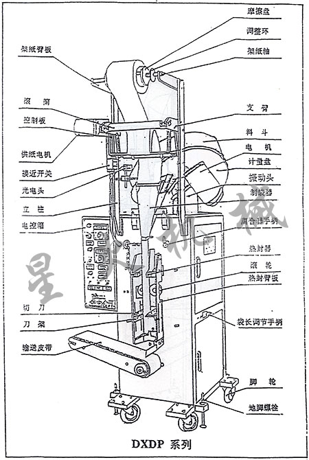 星火片劑自動(dòng)包裝機(jī)結(jié)構(gòu)組成全稱線稿圖: