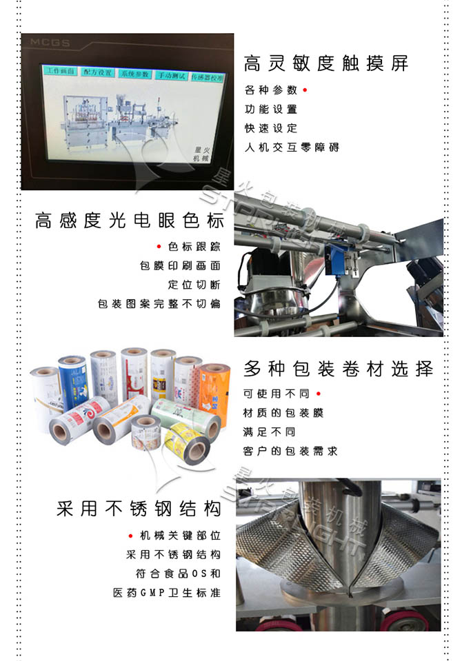 1、蘑菇肉醬包裝機設有光電商標定位裝置,還可附加打字、切口等功能。