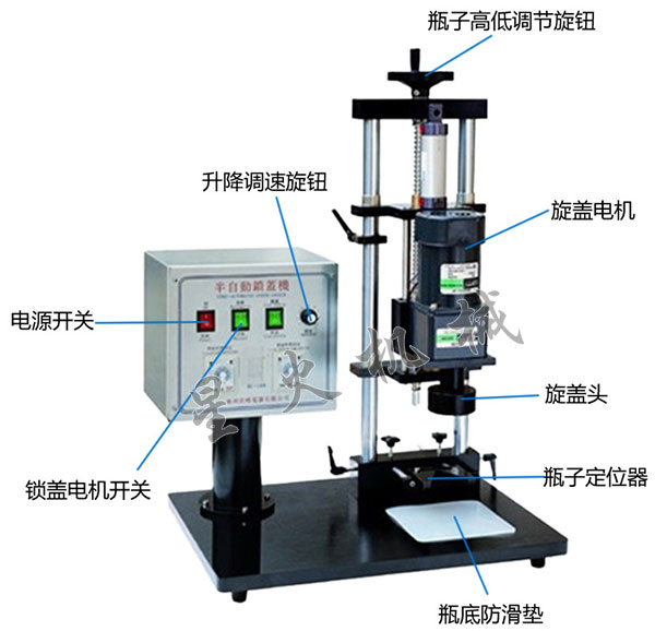 臺式旋蓋機由旋蓋機、旋蓋頭、多檔變壓器三部分組成,便于隨身攜帶。工作時,旋蓋頭罩在瓶蓋上方,旋蓋頭與旋蓋機相連,按動開關(guān),旋蓋頭旋轉(zhuǎn),稍向下用力,0.3-0.5秒鐘即可將瓶蓋旋緊。若把機器配上自動輸送裝置,該旋蓋機即可實現(xiàn)流水作業(yè)。